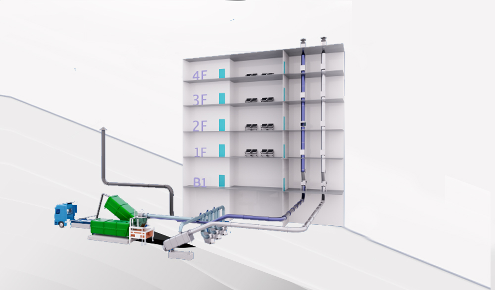 該系統(tǒng)工作原理是通過預(yù)先鋪設(shè)好的管道路由,利用負壓技術(shù)將生活垃圾、污衣被服抽送至中央垃圾收集站,*后分類進行處理回收。